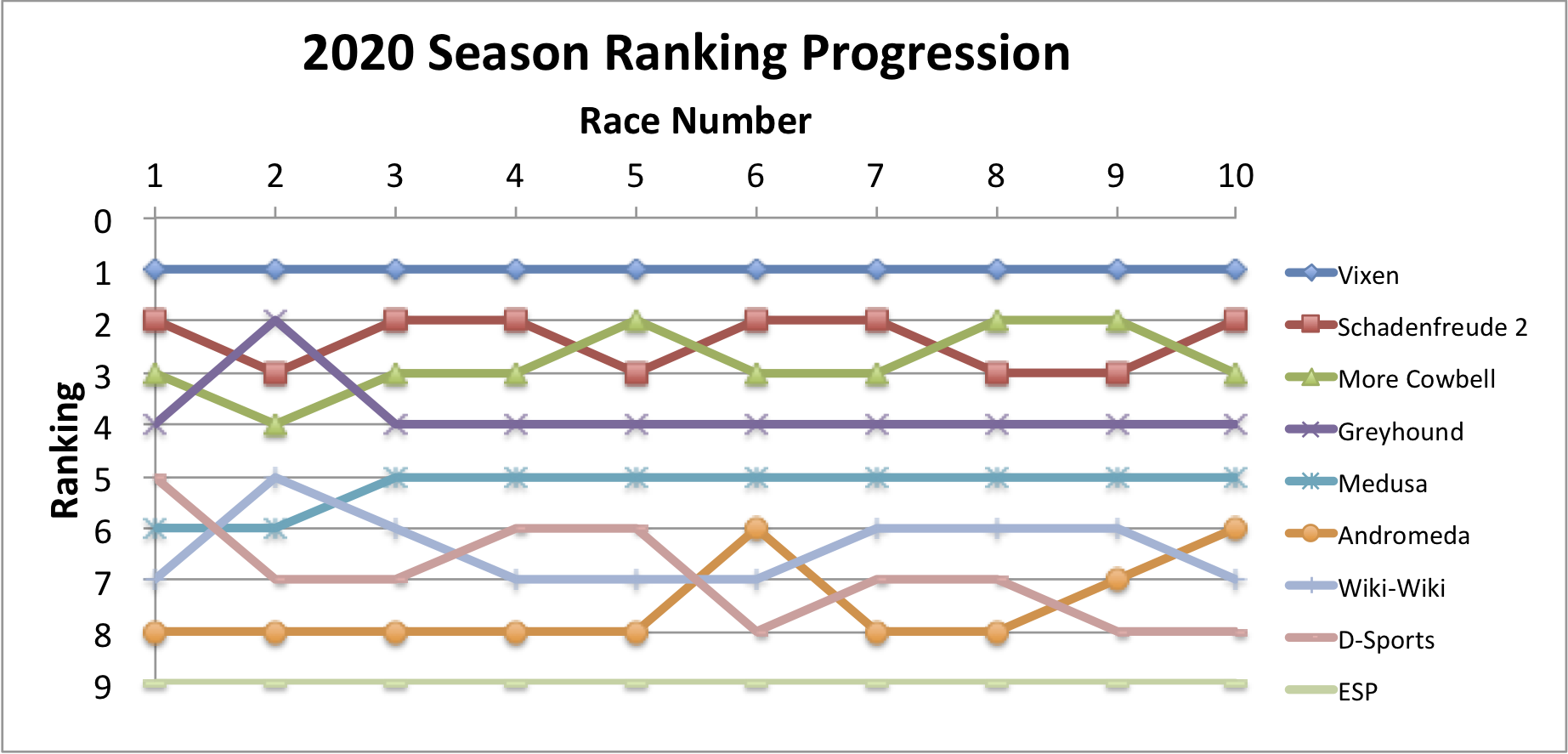 Here is a graph showing each boat’s ranking in the overall season series after each race of the 2018 season.